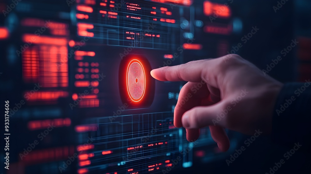 A close-up view of a finger interacting with digital data on a futuristic screen, symbolizing technology and modernization.