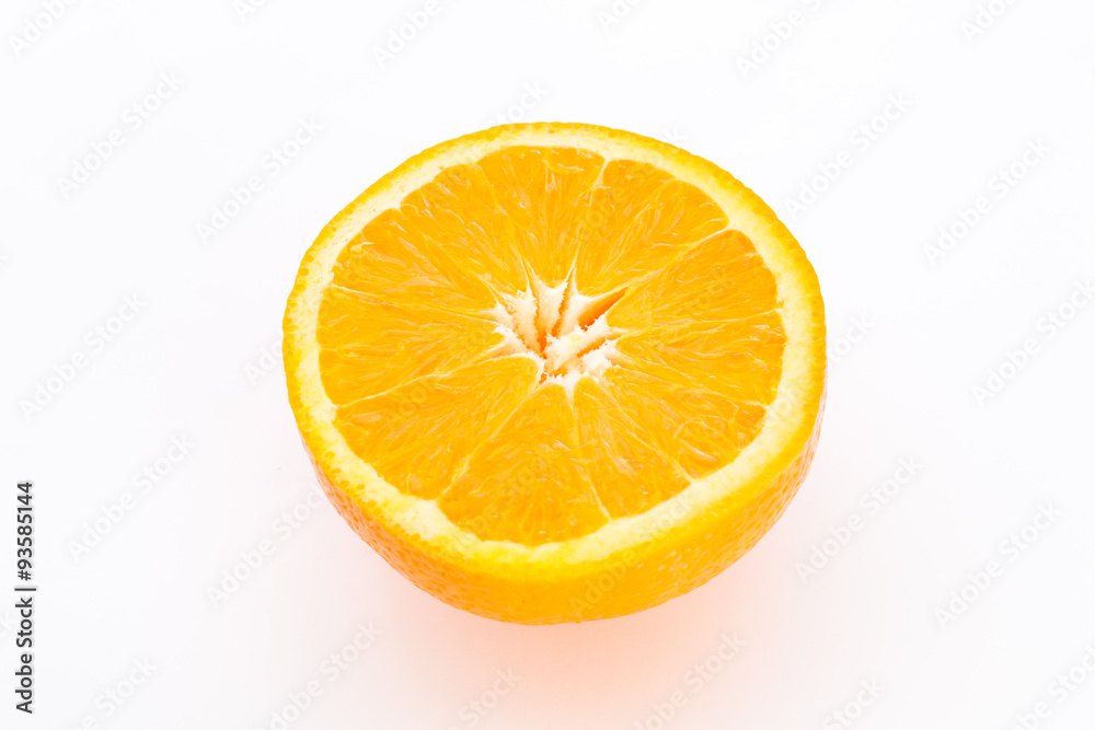 Slice of half fresh orange isolated on white background. Healthy fruit with vitamins.