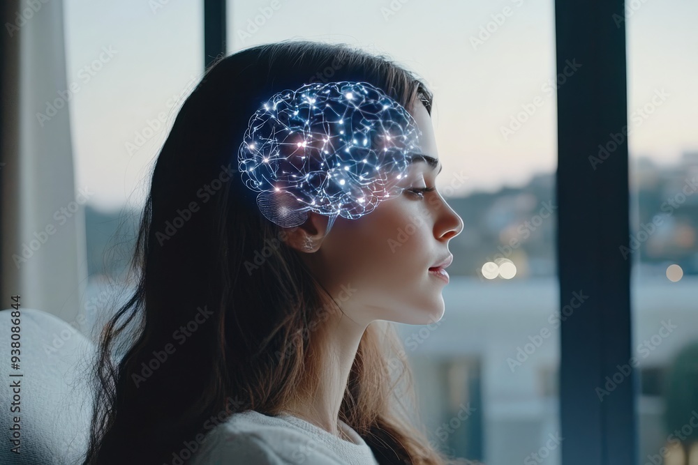 Neurocognitive Intellectual creativity Side profile of a young woman with glowing neural elements emphasizing contemplation and the intersection of nature and technology in an ethereal atmosphere