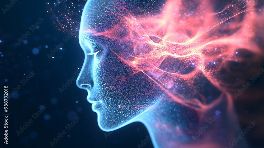 Digital human head connected by glowing neural networks suitable for technology, ai, cybersecurity, innovation, and futuristic concepts in design projects.