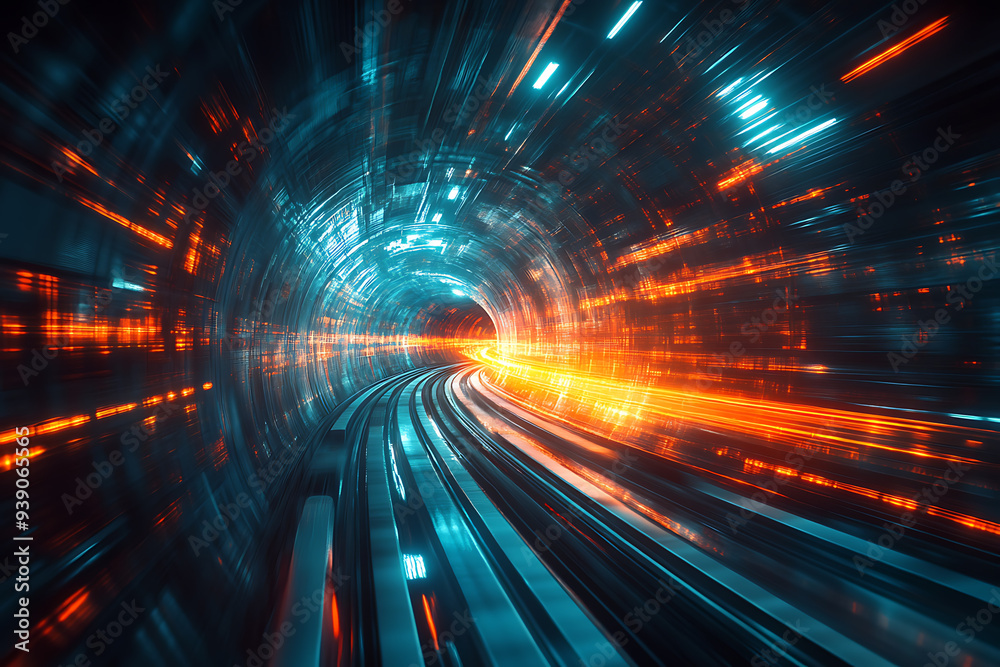 Data lines and abstract blur in a tunnel symbolize tech speed, motion, energy, pattern, and dark movement with blue, orange, and warp concept for internet transmission.