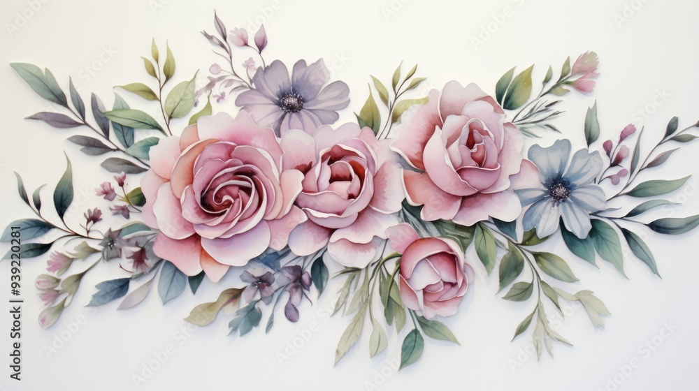 Watercolor illustration of pink flowers and green leaves isolated on white background