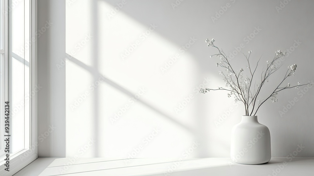 Sunlight Streams Through Window Illuminating White Room With Vase And Branches.