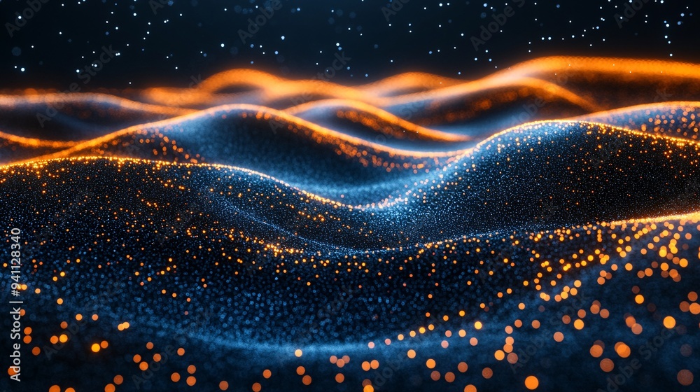 Abstract glowing particle wave background.