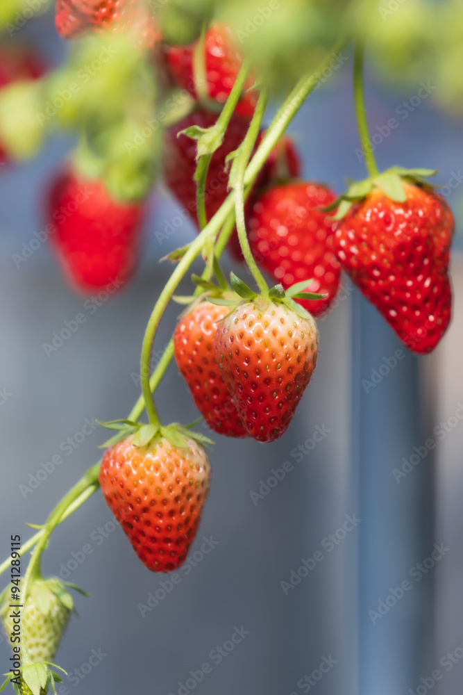 Dutch glass greenhouse, cultivation of strawberries in own garden, growing strawberries plants, red ripe berry and green grass background