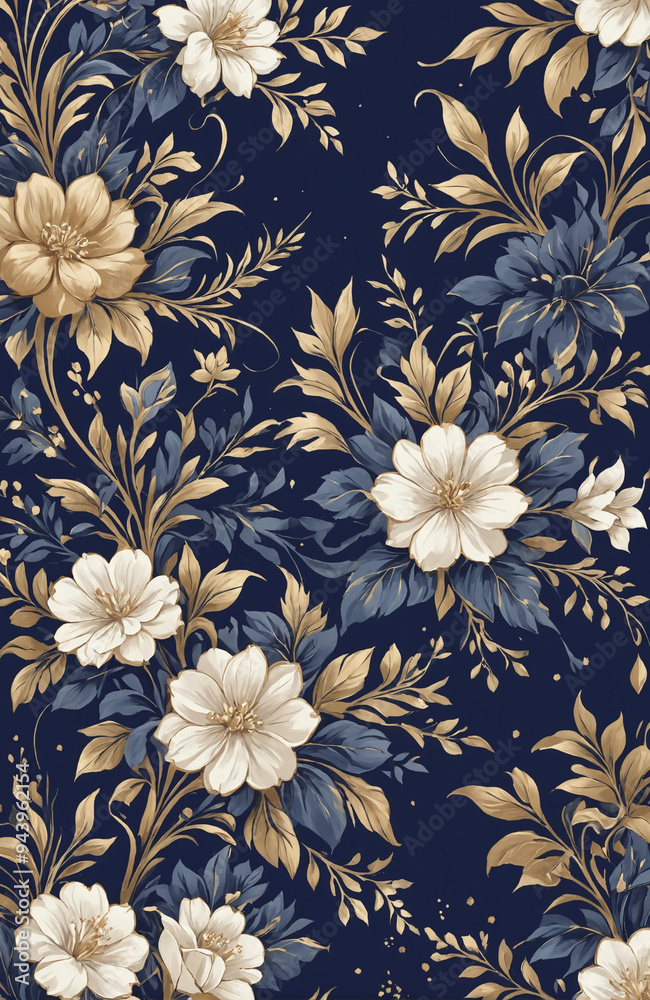 vintage royal navy blue with elegant white and gold flowers pattern
