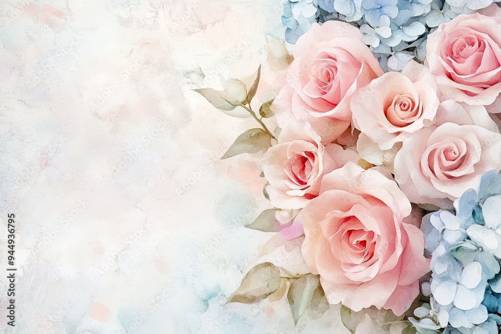 A beautiful arrangement of soft pink roses and delicate blue hydrangeas on a light background, perfect for any floral design project.