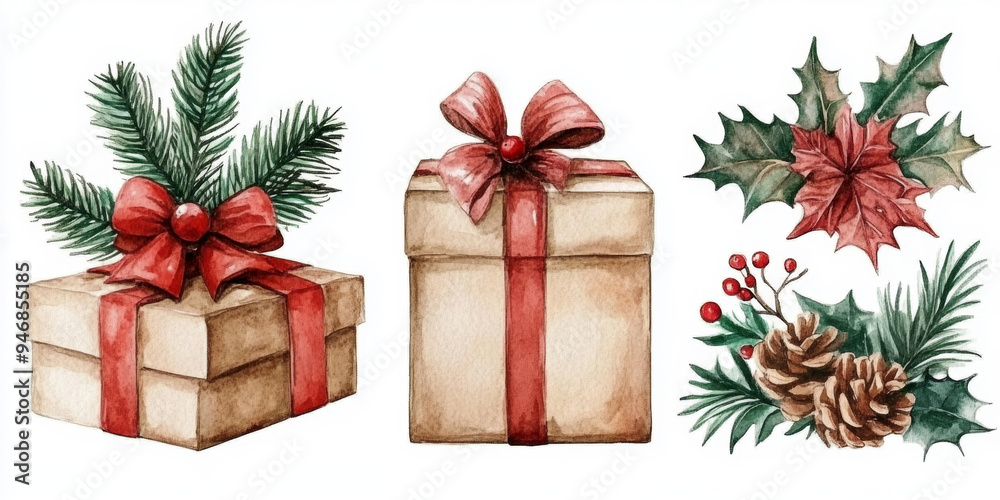 Set Of Christmas Watercolor Elements On White Background Wallpaper Mural - Decorly Solutions | Decorly Solutions