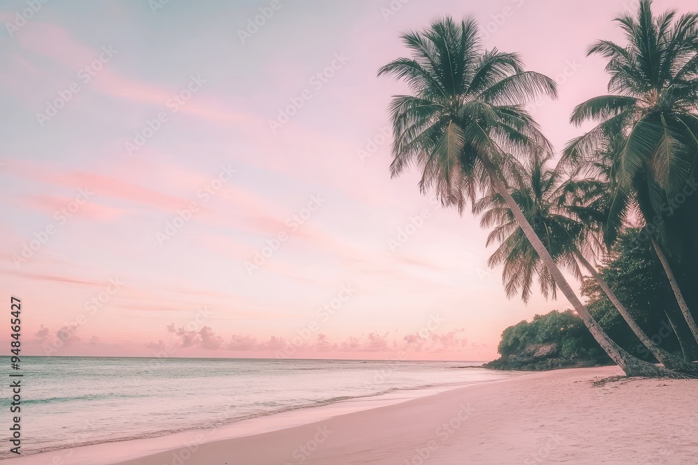 A breathtaking sunset over a tropical beach, palm trees swaying in the breeze