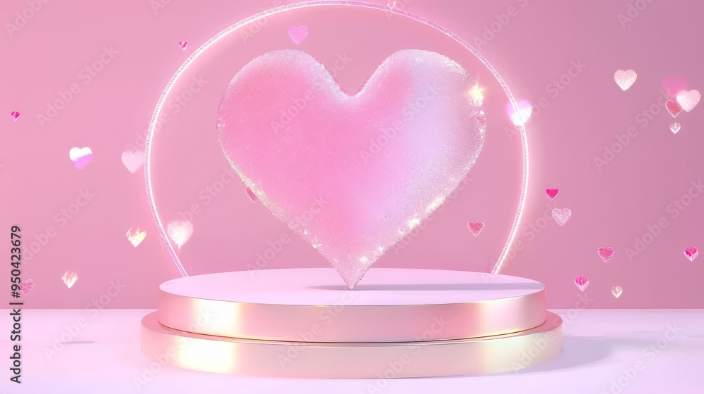 glossy pink heart floats above round podium surrounded by small heart shapes and sparkles, creating romantic and dreamy atmosphere