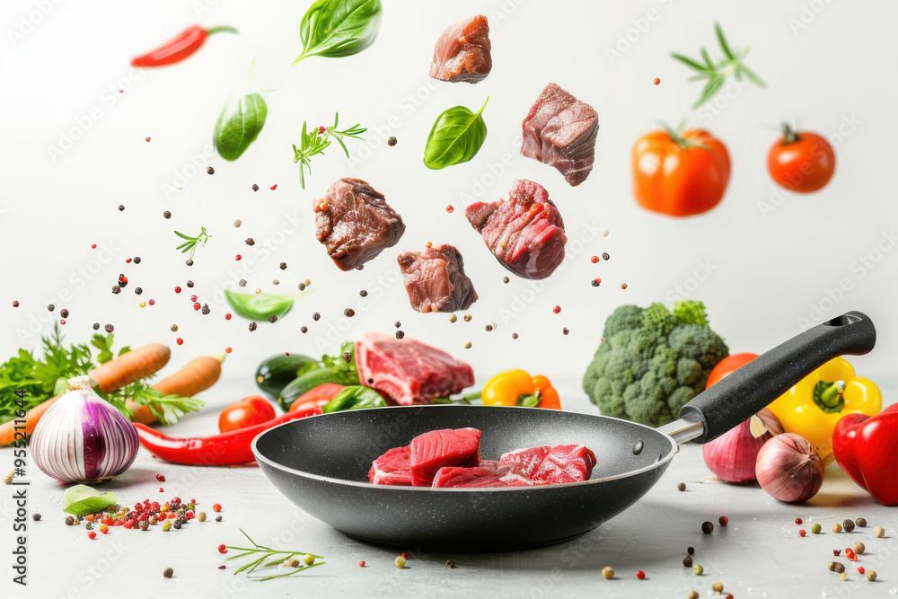 Capture the dynamic and playful essence of cooking with this image of vegetables flying out of a pan