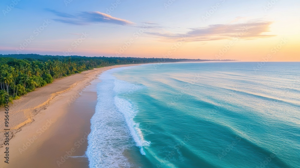 Aerial a tranquil beach at sunrise with gentle waves washing Wallpaper