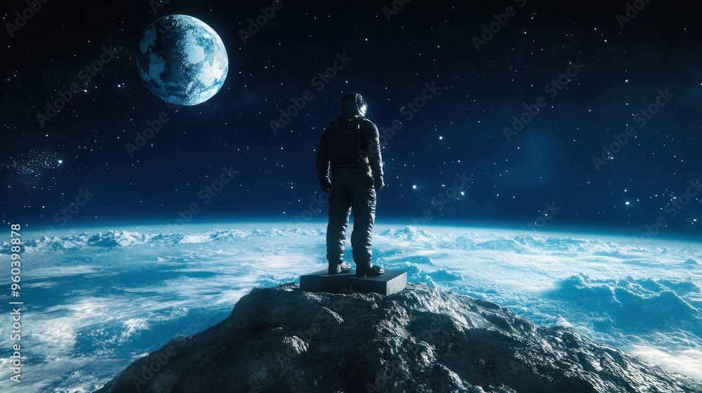 Man in a spacesuit stands on a planet with a large red fire in the background. The scene is set in outer space and the man is looking up at the fire. Scene is one of awe and wonder