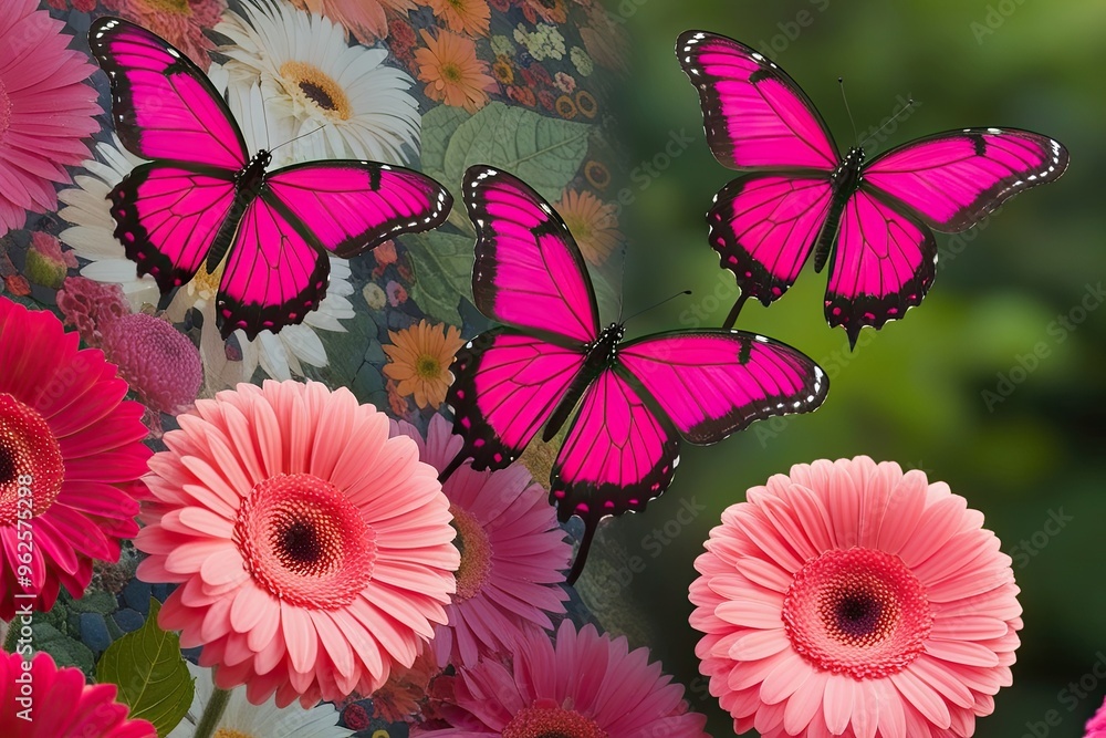 Mesmerizing Fuchsia Butterflies Hovering Near Brilliant Gerbera Flowers Wallpaper Mural - Decorly Solutions | Decorly Solutions