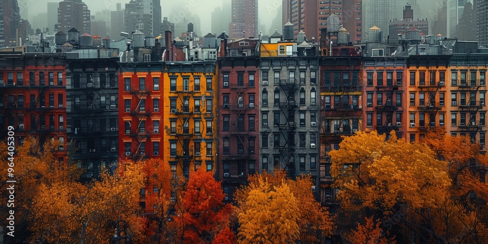 A Colorful Autumn Cityscape Featuring A Row Of Wallpaper Mural - Decorly Solutions | Decorly Solutions