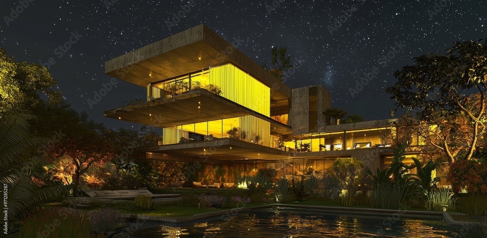 Luxury ultra modern villa with large glass windows at night. Stock photo.