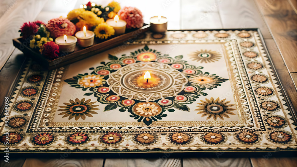 Vibrant Flat Rangoli Design With Floral Border Frame Wallpaper Mural - Decorly Solutions | Decorly Solutions