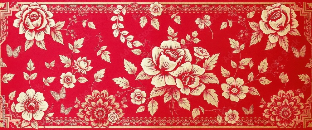 Ornate Floral Pattern with Red and Gold Roses on a Red Background