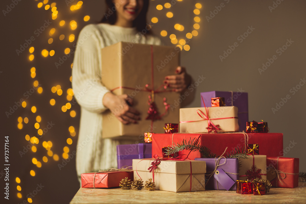 dreaming woman in thick white cable sweater wrapping presents on the background of Christmas decorations and lights