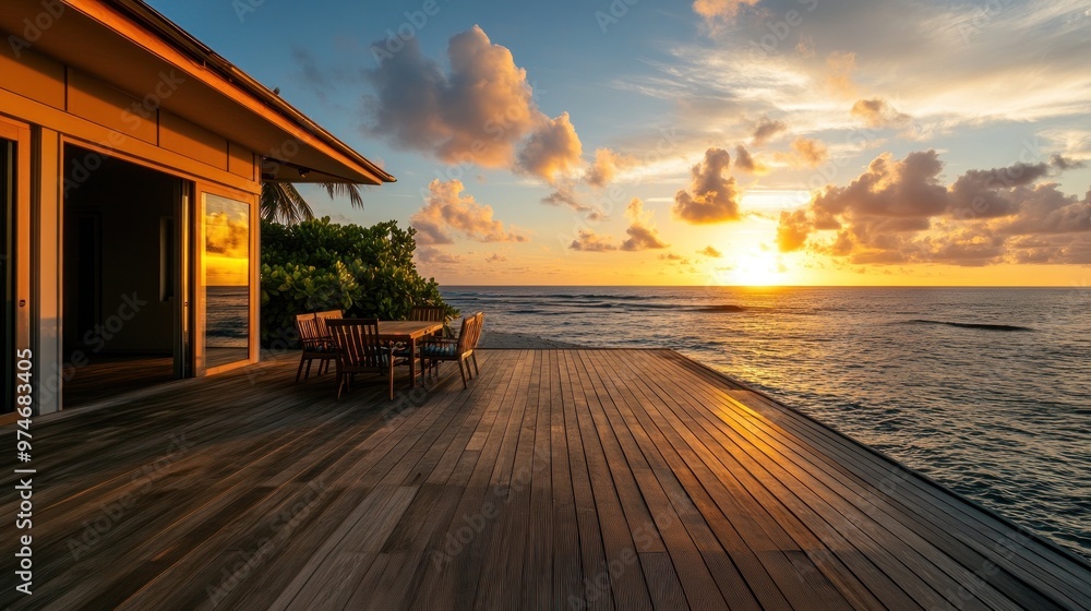 Serene Sunset Over Calm Waters with Modern Wooden Deck and Glass Walls Highlighting Nature's Beauty in a Tranquil Seaside Setting
