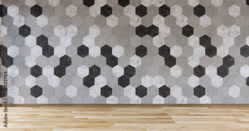 White and black hexagon tiles wall on wooden floor Modern ro Wallpaper
