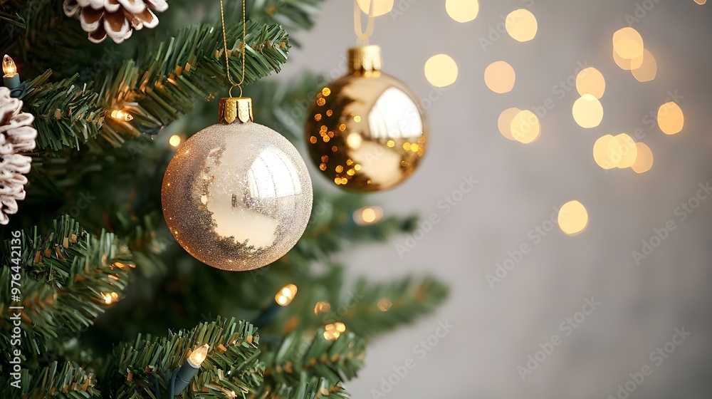 Gold Christmas Ornaments On Green Tree With Lights Wallpaper Mural - Decorly Solutions | Decorly Solutions