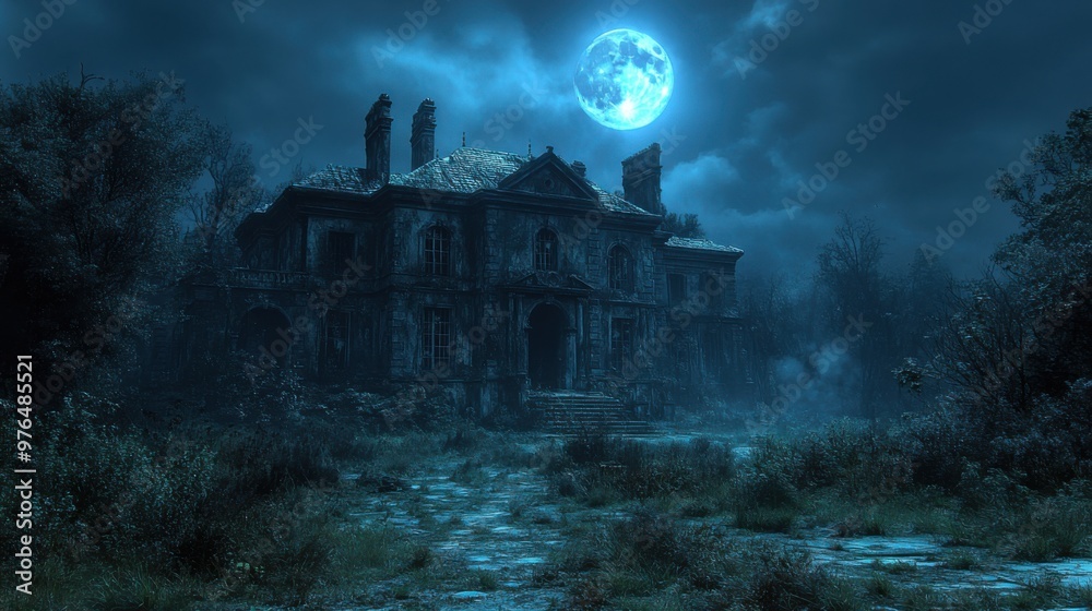 Eerie Haunted Mansion at Night with Full Moon and Foggy Atmosphere, Illuminated Windows, and Overgrown Pathway in Spooky Forest