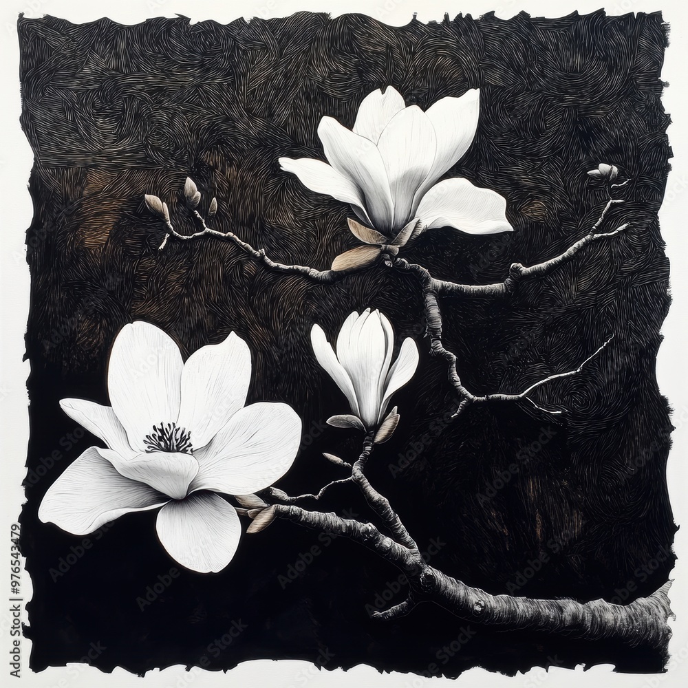 Watercolor Illustration Of White Magnolia Flower On Black Background