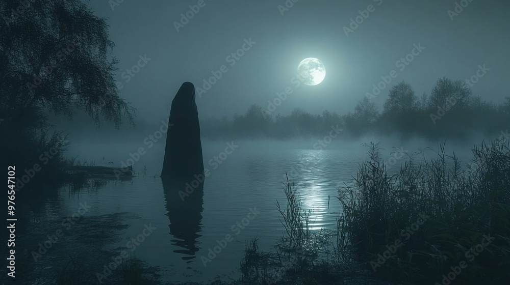 Haunting Presence Ghostly Apparition Over A Foggy Lake Wallpaper Mural - Decorly Solutions | Decorly Solutions