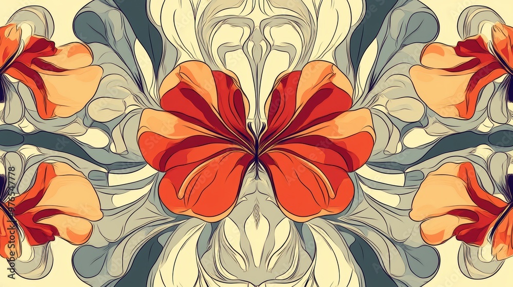 A colorful flower with a purple center and orange petals. The flower is surrounded by a pattern of other flowers and leaves. Scene is vibrant and cheerful