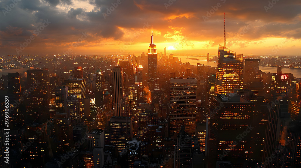 New York City Skyline at Sunset with Illuminated Skyscrapers and