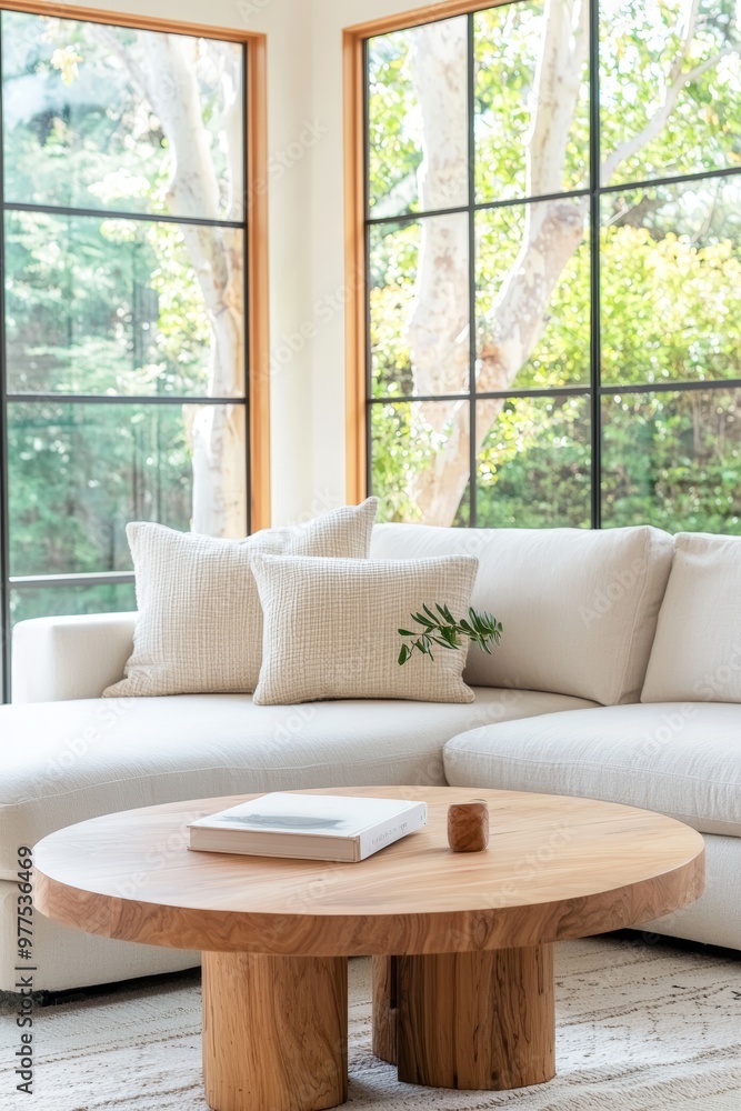 Sunlit living room, white wall, minimalist decor, large windows, bright furniture - neat luxury contemporary