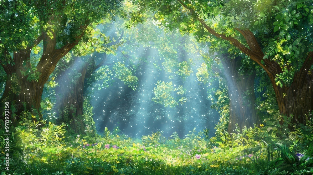 A serene forest glade bathed in sunlight filtering through the trees. Lush green foliage and a peaceful atmosphere.