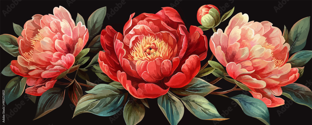 Fresh Peony Flowers On Black Isolated Background Vector Wallpaper Mural - Decorly Solutions | Decorly Solutions