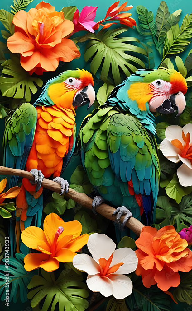 Vibrant Tropical Rainforest Birds Displaying Stunning Colors Amidst Lush Green Foliage and Flowers