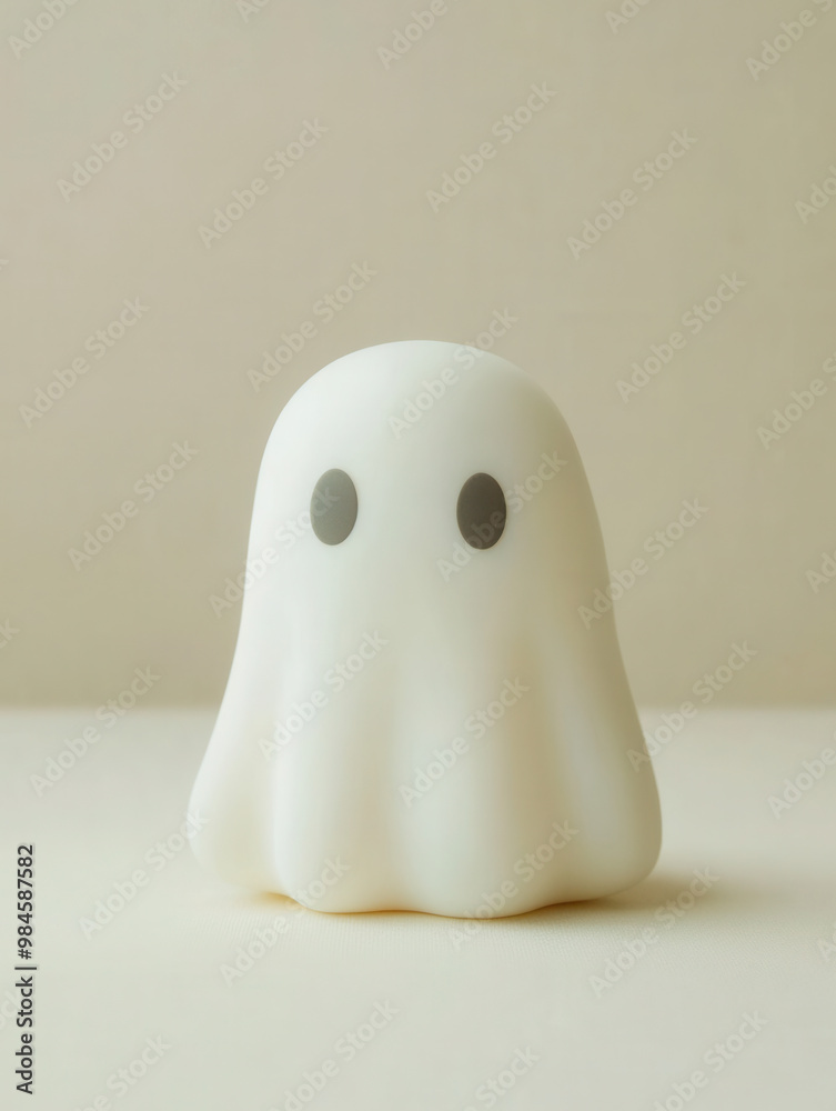 Halloween concept image: a small, simple cartoon ghost with a white sheet-like body and two large, black oval eyes