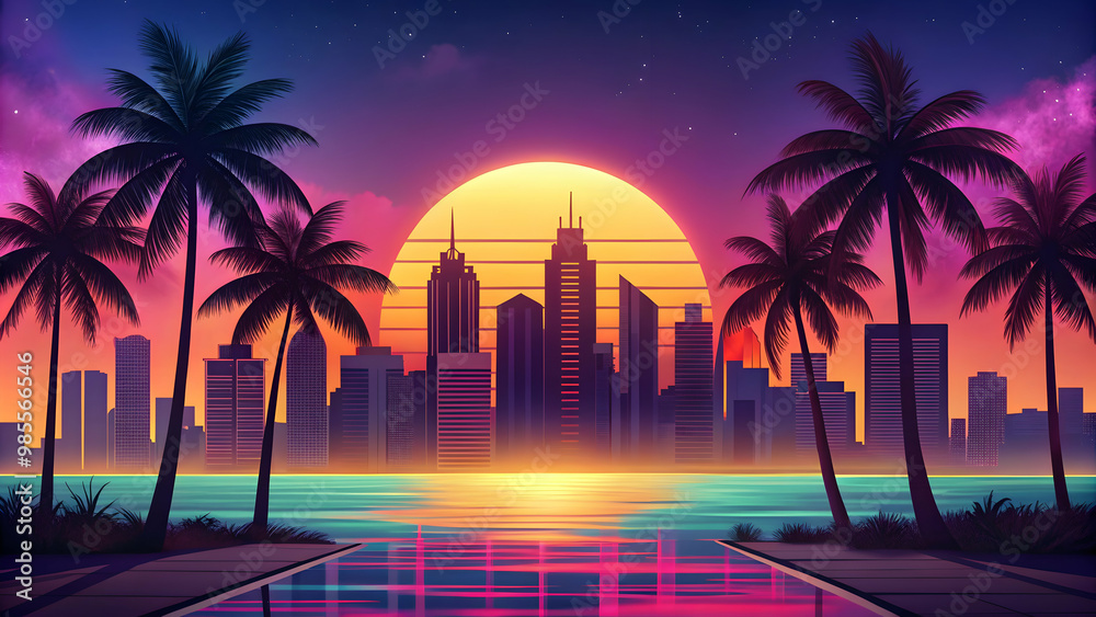 Retro-inspired cityscape illuminated by neon lights, set against a tropical beach at sunset.