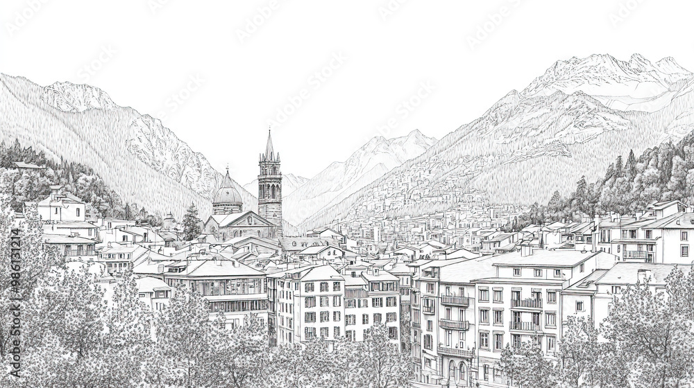 Detailed Sketch Of A European City With Mountains And A Lake.