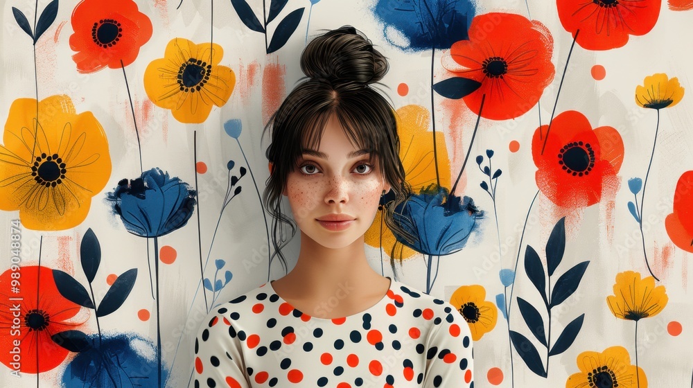 Bold retro patterns in a stylish portrait, 70s-inspired with modern color pop and a chic, vibrant look