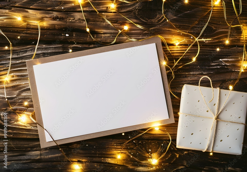 Blank White Cards With String Lights On Wooden Wallpaper Mural - Decorly Solutions | Decorly Solutions