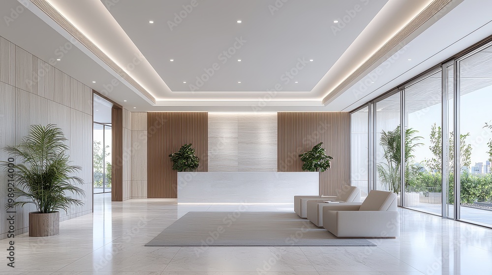 Minimalist Kitchen With Sunlight, Plants, And Wooden Stools.
