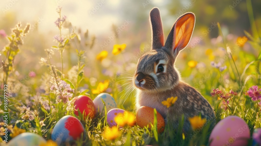 Easter Bunny in a Meadow: A charming Easter bunny sits amidst a vibrant meadow filled with colorful Easter eggs and spring flowers, embodying the spirit of springtime and celebration.