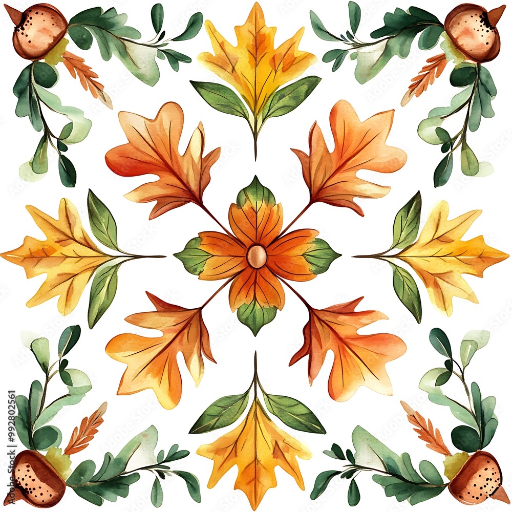 Watercolor Floral Pattern with Autumn Leaves and Berries Wallpaper