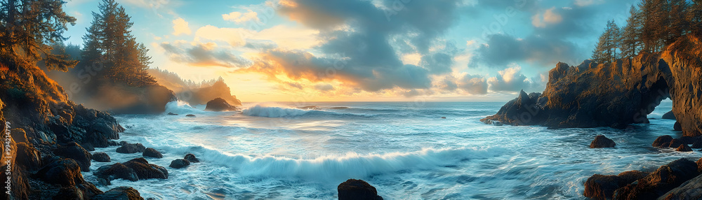 Rocky Coastline With Crashing Waves At Sunset Wallpaper Mural - Decorly Solutions | Decorly Solutions