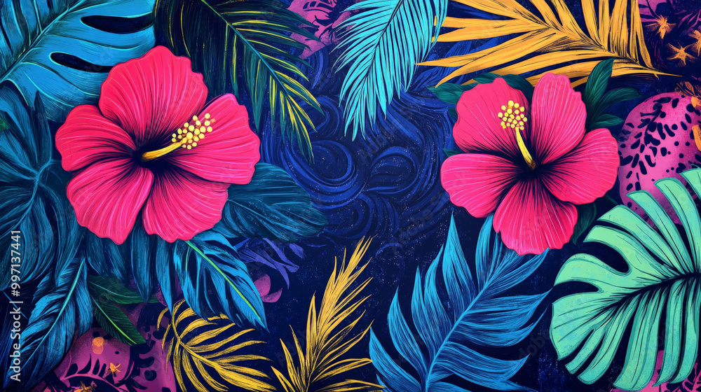 A vibrant, seamless pattern showcases lush tropical leaves and blossoms in a rich, saturated palette, evoking a sense of exotic paradise.