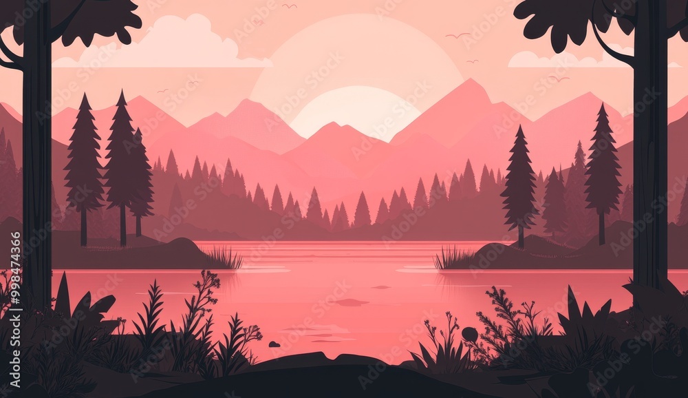 Serene Sunset Over Calm Lake Surrounded by Majestic Pines