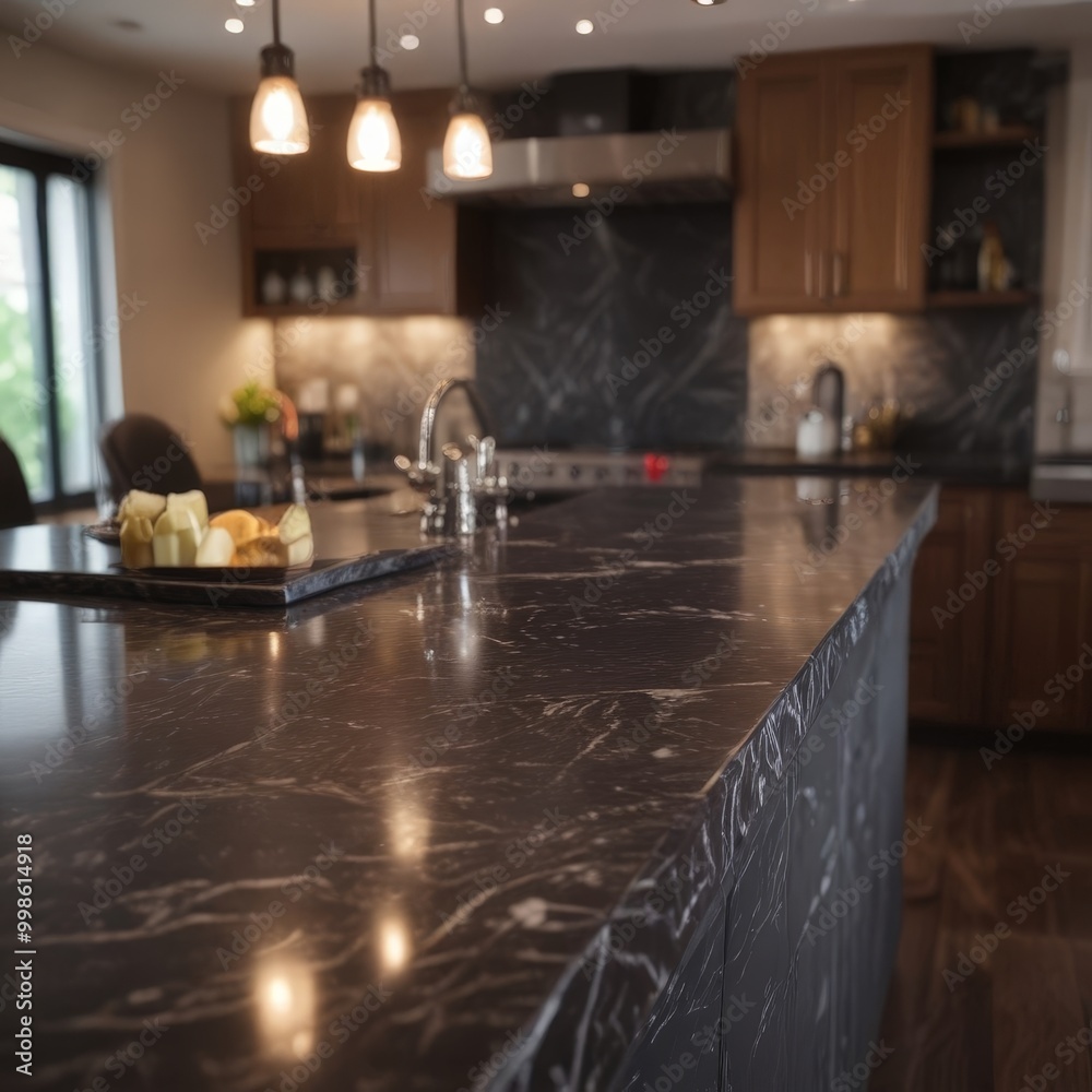 A modern kitchen with a large black marble countertop wooden Wallpaper