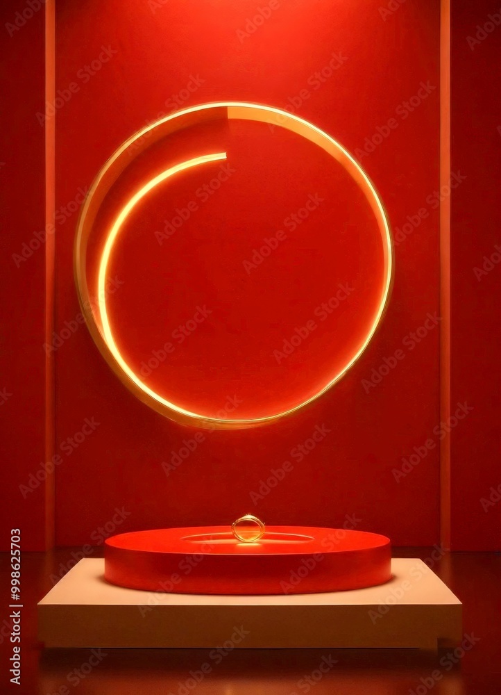 A red circular platform with a gold ring on top set against Wallpaper